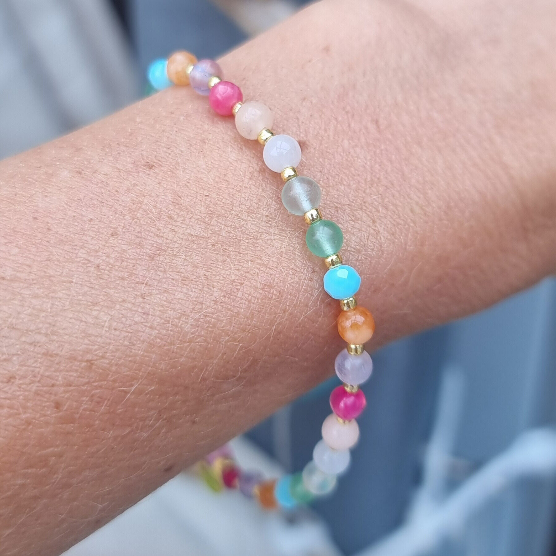 Zwischen den Edelsteinen funkeln edle, vergoldete Miyuki-Perlen, die dem Armband einen Hauch von Eleganz verleihen. Ob als Glücksbringer.